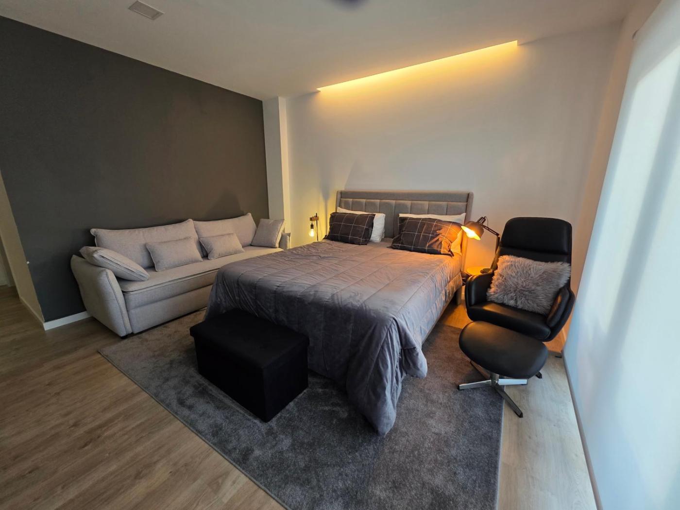 Quarto Duplo Amplo. Featuring free toiletries and bathrobes, this double room includes a private bathroom with a shower, a bidet and a hairdryer. Guests can make meals in the kitchenette that features a refrigerator, kitchenware, a microwave and a toaster. The spacious air-conditioned double room features a flat-screen TV with streaming services, a minibar, a tea and coffee maker, a wardrobe as well as city views. The unit has 1 bed.