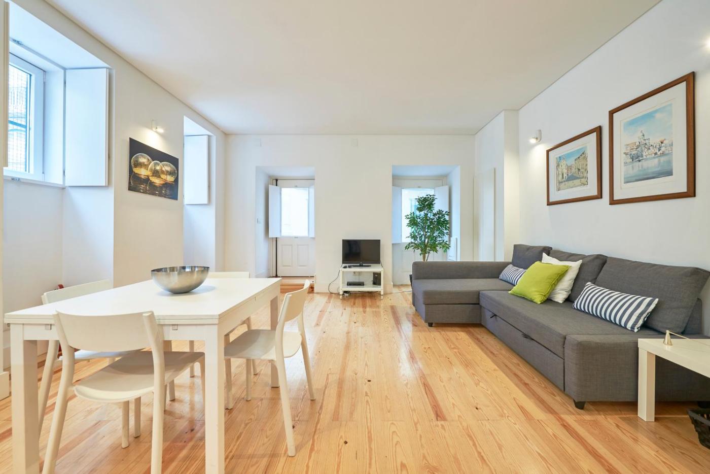 Apartamento - Piso Térreo. The apartment has one bedroom with a double bed, as well as a double sofa bed in the living room. The living room is furnished with a TV, a sofa and dining table and chairs. The kitchen is fully equipped with a fridge, dishwasher, coffee machine, oven and hotplate. There is one bathroom with a shower, toilet and basin. There is free high speed WiFi in every room. Towels and bed linen are included.
